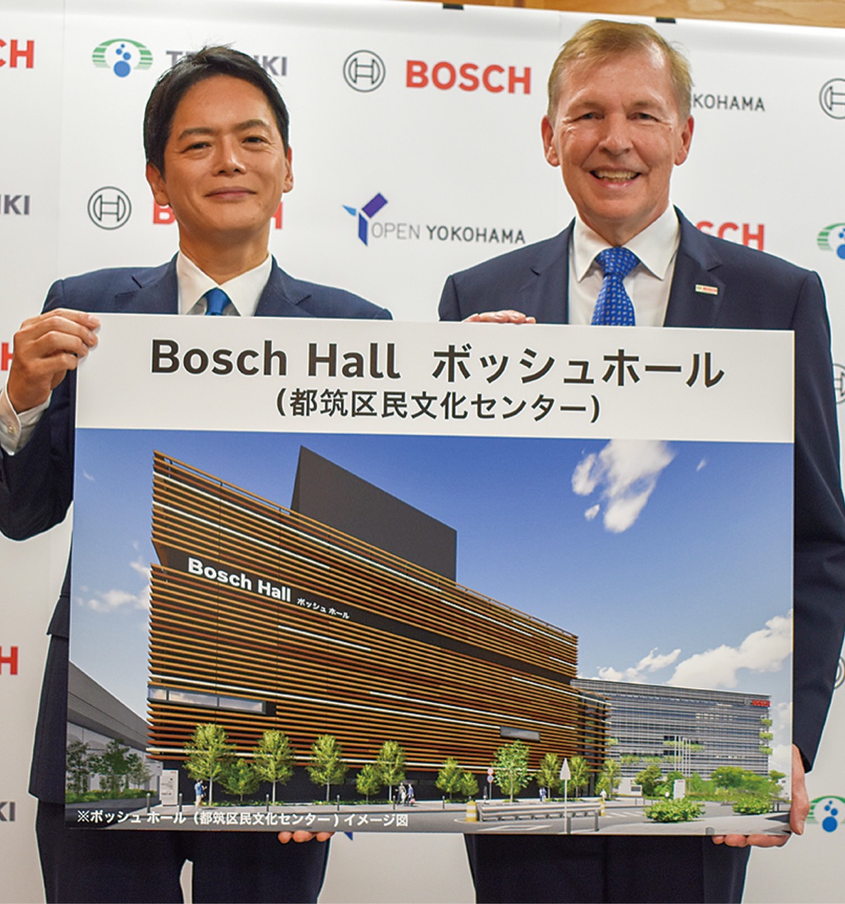 都筑区役所で行われた締結式には、ボッシュのクラウス・メーダー社長や山中竹春市長らが出席。メーダ―社長は日本語で同社が日本での事業を横浜で開始したことや牛久保に30年以上、研究開発拠点があることにふれ、「皆さんにボッシュのことをもっと知ってもらえればうれしい。今以上に地域の発展に貢献していきたい」と話した。山中市長は「これまでも都筑区のにぎわい創出に多大なご協力をいただいている。契約締結を機に、さらに連携を深め多くの市民に親しまれる施設になるよう取り組んでいく」と話した。