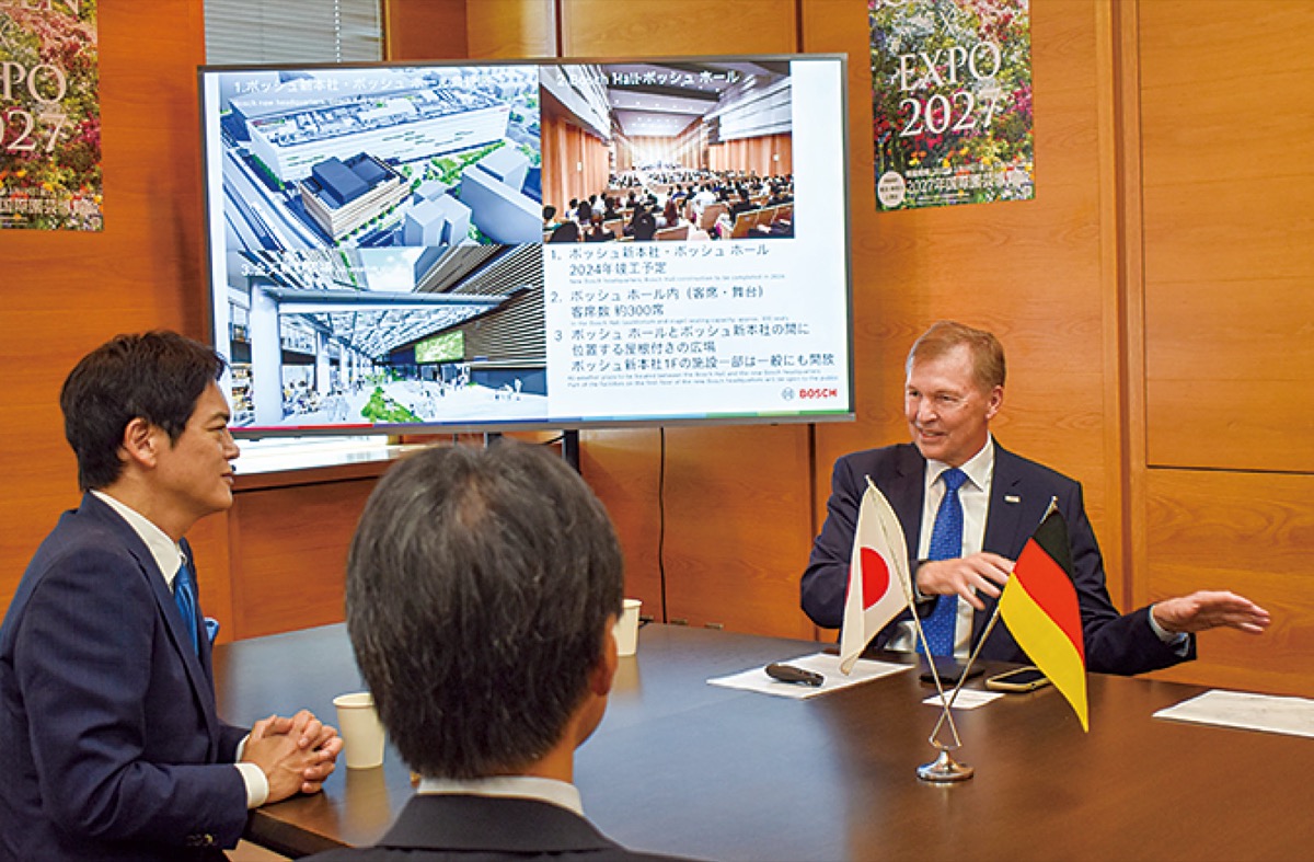 席上でメーダ―社長は、2つの建物の間にはイベントなどで活用できる屋根付きの広場(約1000平方メートル)を設置し、文化交流や地域活性化の促進を目指すと提案。「共有スペースは、地域の人やNPOなどの団体にも使っていただき、にぎわいを創出していきたい」と話した。さらに、周辺施設と一体となったエリア活性化や約2キロ離れた牛久保の研究拠点を自動運転シャトルバスで結ぶビジョンも披露した。