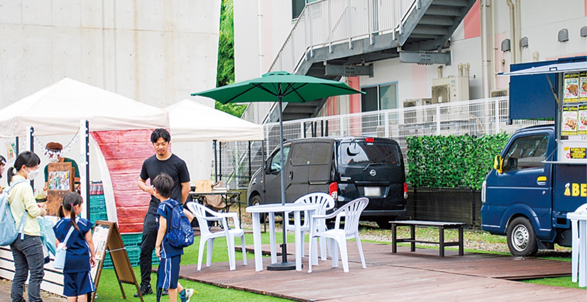 約525平方メートルの区画には、日替わりのキッチンカーをはじめ、野菜直売所などが並び、飲食や歓談、一休みに利用できる場を提供している。他にもウッドデッキは落書きゾーンになっており、子どもも気軽に楽しめる。