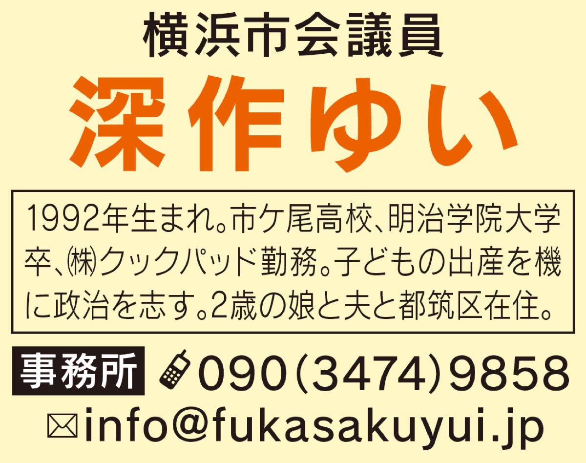 「これってどうにかならないのかな?」と思うことがございましたら、お気軽に深作ゆい事務所までご連絡ください。皆さんと一緒に、より良い都筑区を作ってまいりたいと思います。