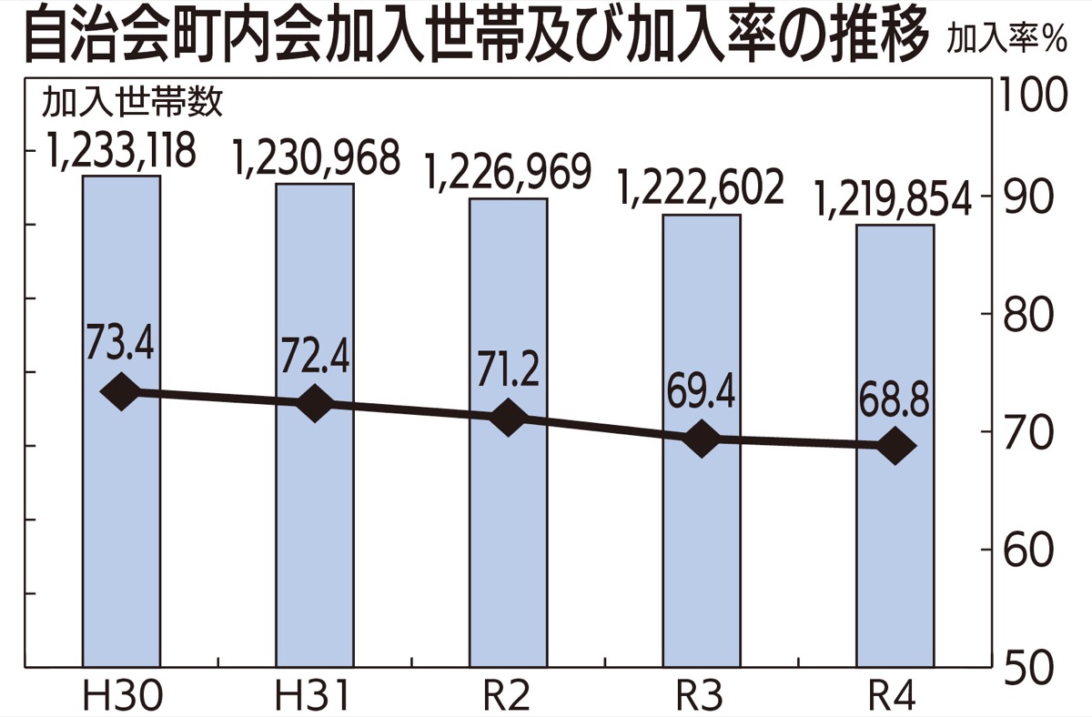 加入率は昨年4月で68・8%。5年間で4・6ポイント減少するなど=表参照、いずれの区も年々減少傾向にある。都筑区は57・7%で、18区の中で一番低い。役員・委員等の担い手不足や高齢化、行政からの依頼事務等への負担感などが課題となっている。