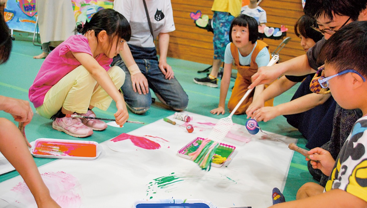プログラムの最初には「体ほぐし体操」と称し、ウクレレや太鼓の音に合わせてゆらゆらと体を動かした。体を温めた後は、地面に置かれた模造紙に、色々な種類の絵具を使い、音楽を聞きながら、思い思いに筆やブラシを走らせた。イベントには午前、午後合わせて10家族が参加した。参加した人は「音楽を聞きながら絵を描くという非日常感が良かった。また参加したい」と話した。