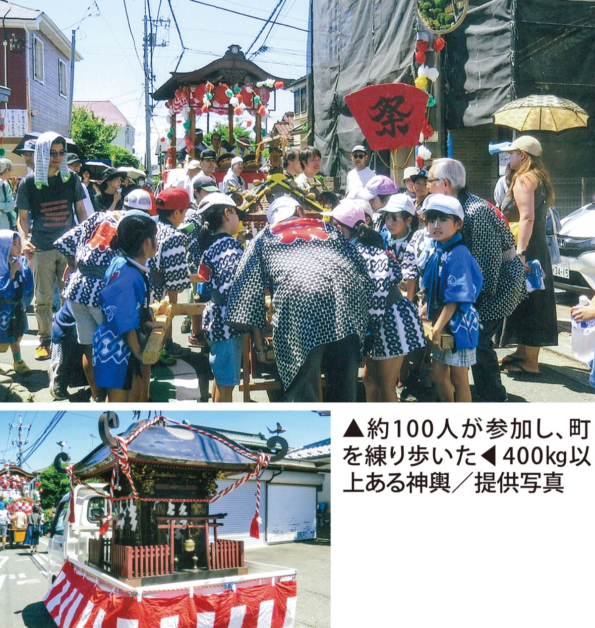 川和町の八坂神社・天王様で7月30日、8年ぶりとなる本祭りが開かれた。もともと5年ごとに行われていたが、コロナ禍で中止が続いていた。氏子総代の城所孝司さんは「みんなが待っていたお祭り。久しぶりで、山車の組み立てなど忘れていて準備は大変だったが、実施できてよかった」と喜ぶ。当日は、子どもから大人まで約100人が参加し、山車や神輿とともに約500mの通りを練り歩いた。