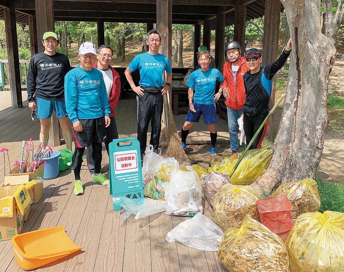 毎月第1日曜日の朝、徳生公園=南山田=ではランニングウェアの人たちがごみ拾いをしている。清掃しているのは、都筑区のランニングクラブ「横浜都筑AC」のメンバーだ。