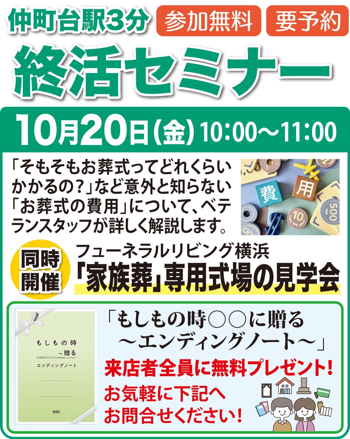 「お葬式ってどのくらいの費用がかかるの?」――。そんな素朴な疑問に答えてくれる終活セミナーが10月20日(金)、仲町台駅徒歩3分にある家族葬専用式場「フューネラルリビング横浜」で開催される(運営/メモリアルアートの大野屋)。午前10時〜11時。参加費無料で事前予約制。