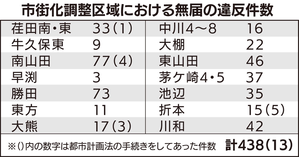 秋山さんは23年1月までの調査結果を、「市民からの提案」を通じて数十回にわたり横浜市に提出。市建築局からの回答によると、指摘した都筑区内の建築物451件のうち、都市計画法の手続きが無届だった違反件数は438件だった。定期的に調査した場所を歩き変化を観察している秋山さんによると、指摘した建築物が撤去された事例もあったという。
