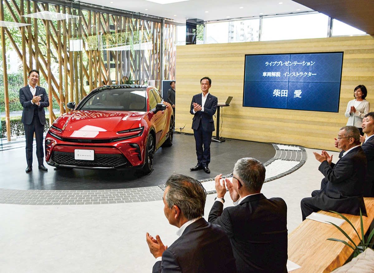 式典には同社の宮原漢二社長をはじめ、トヨタ自動車や地域の関係者らが参加。のれんがかかった店舗入口や県産木材で作られたテーブル、日本庭園をイメージした車両展示スペースなど「和モダン」で統一された店舗コンセプトが説明されたほか、同日発表された新型クラウンスポーツがお披露目された。