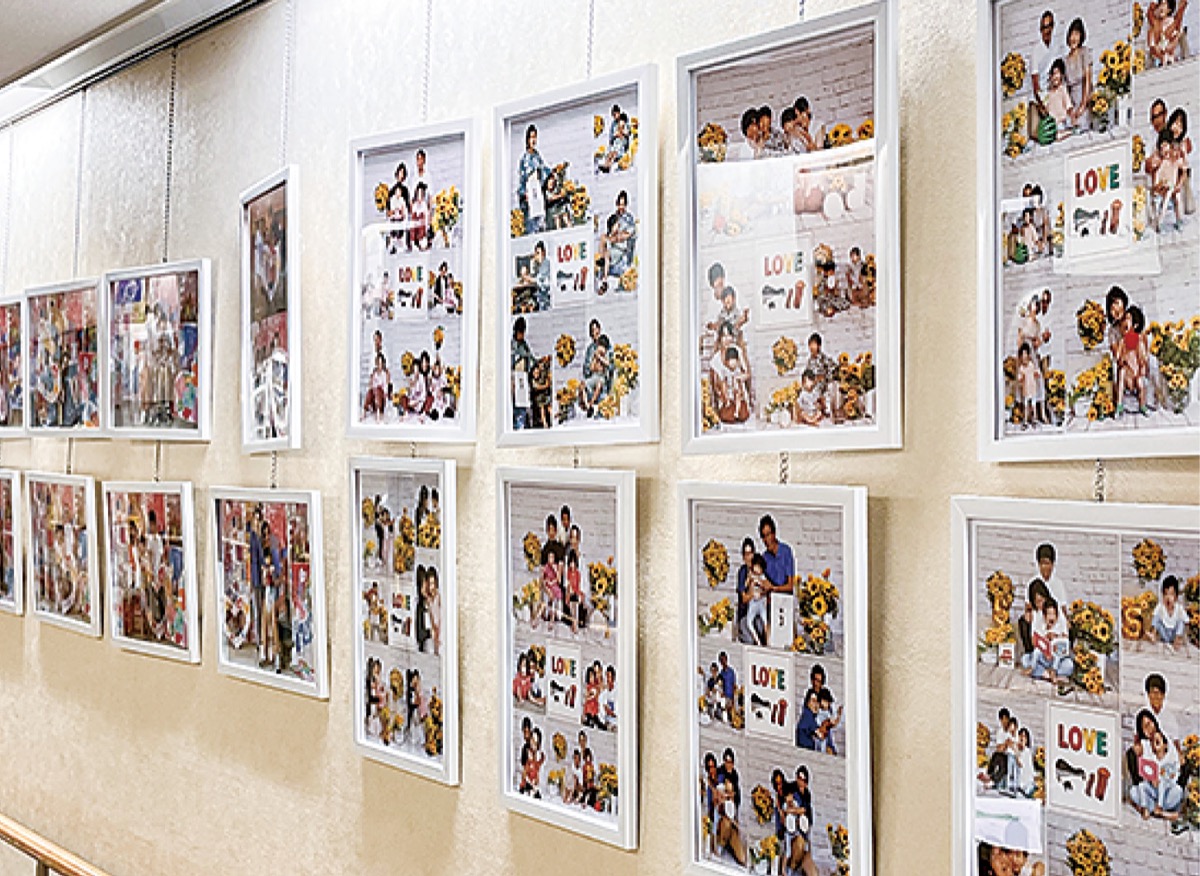 障害のある子どもとその家族が「笑顔」で写っている写真と施設の利用者らが制作した作品、計約150点が1階廊下に並ぶ。7月に同所で開催されたイベントで制作された色鮮やかな作品もある。作品展示は11月28日(火)まで。