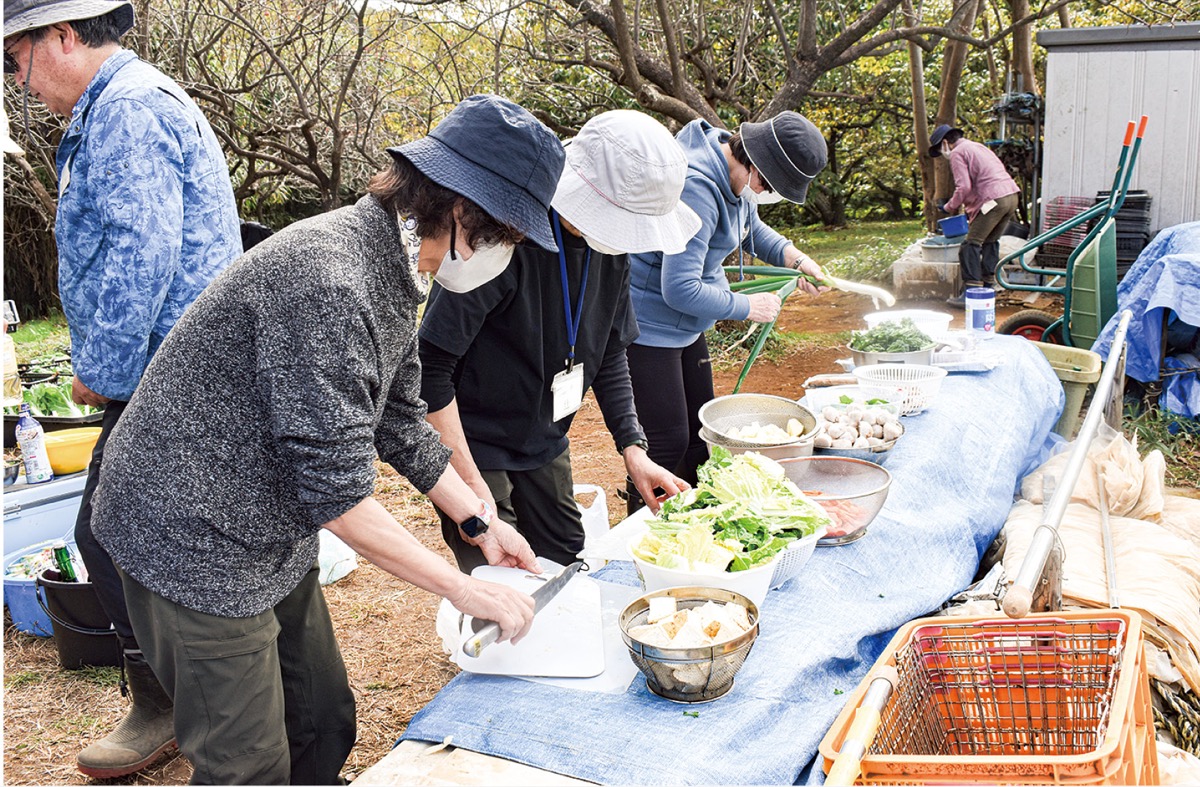 区内池辺町の畑で活動する「シニア楽農園」は11月23日、収穫を祝う芋煮会を開催した。会員やOBら約30人が参加。朝から畑で収穫した里芋や大根、水菜、ブロッコリーなどで芋煮やチゲ鍋、水菜のサラダ、ハッシュドチキンなどを作った。作業後は皆で食事を楽みながら親睦を深めた。会員の加藤均さんは「天気もよく、豪華な料理でみんな楽しめてよかった」と話した。