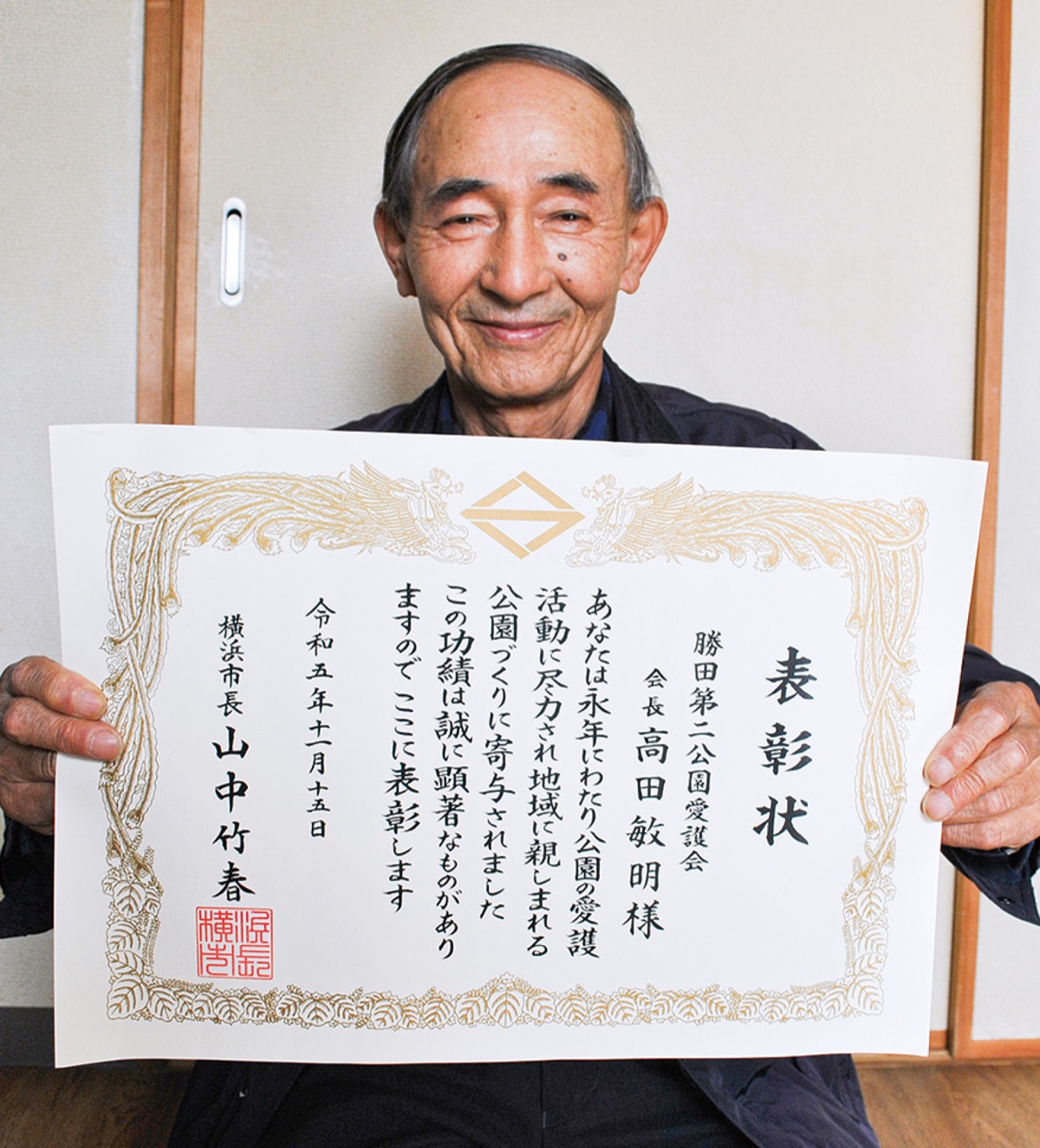 10年以上愛護会会長を継続して務めた人が受賞する個人表彰の部では、くさぶえのみち牛久保西二丁目公園愛護会の唐戸正治さん、同三丁目公園愛護会の長部照義さん、勝田第二公園愛護会の高田敏明さんの3人が受賞。団体表彰の部では、東山田公園愛護会(酒井一郎会長)が受賞した。