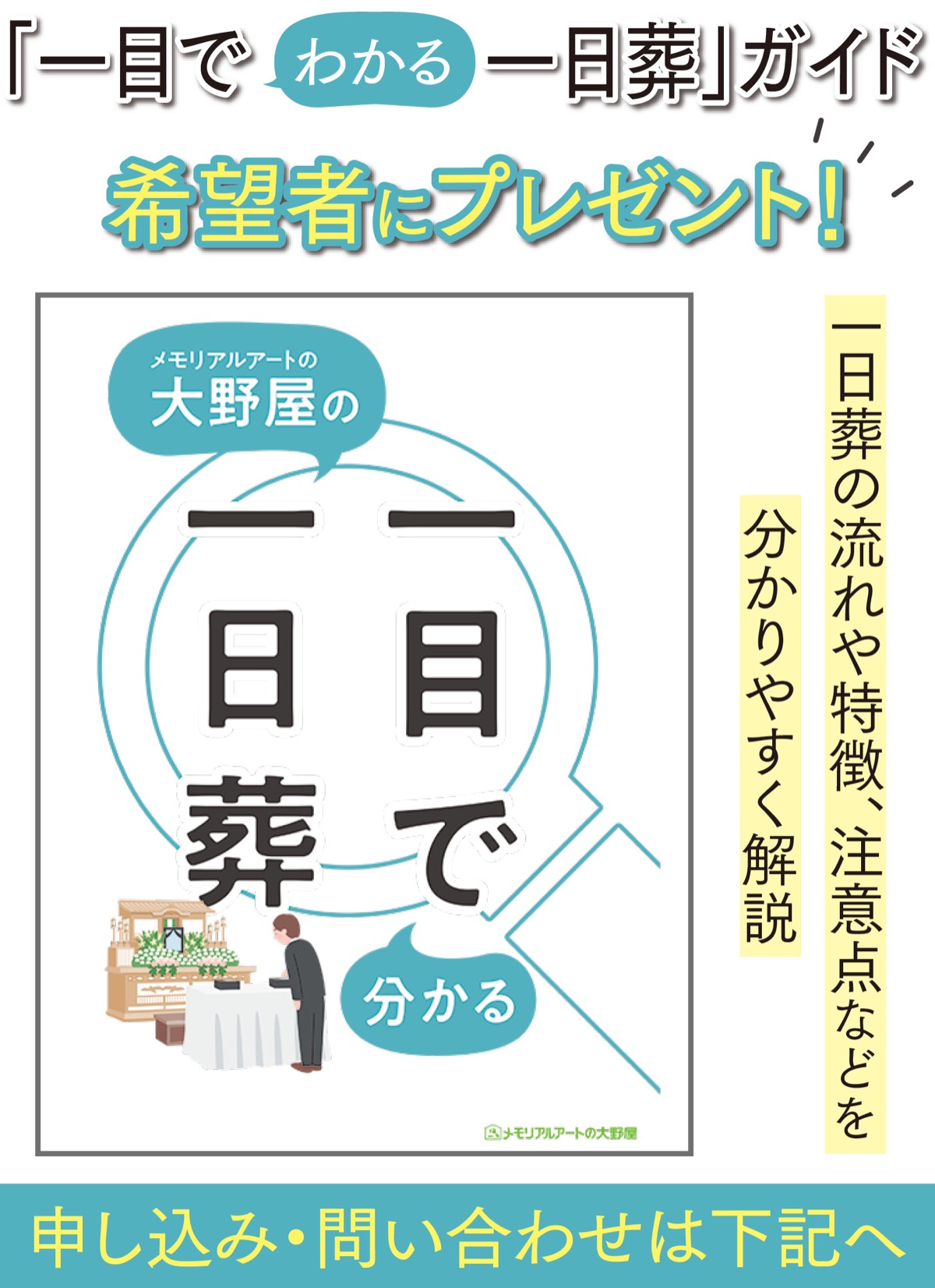 近年、注目されている「一日葬」。「漠然としたイメージはあるけど、どのような葬儀かよく分からない」――。そんな人のため、仲町台駅徒歩3分にある家族葬専用式場「フューネラルリビング横浜」を運営するメモリアルアートの大野屋は、「一目で分かる一日葬」ガイドを希望者にプレゼントしている。