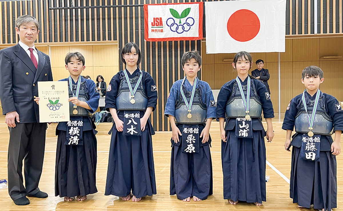「第46回全国スポーツ少年団剣道交流大会神奈川県予選会(団体戦)」が12月2日に行われ、都筑区勝田町の養浩館道場(櫻井裕介館長)の小学生5人が初優勝を飾った。メンバーの横溝瑛音さん(6年)、八木遥さん(同)、栗原大さん(同)、山浦千怜さん(4年)、藤田尊史さん(4年)は3月に行われる全国大会に出場する。