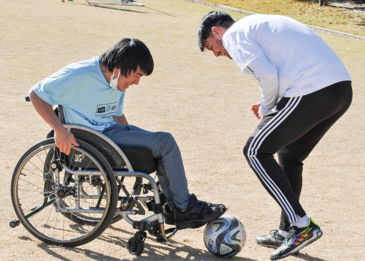 「障害者にもスポーツの楽しさを知ってほしい」――。そんな思いから横浜F・マリノスのユース出身の選手4人が12月8日、都筑区障害者事業所ネットワーク「てつなぎつづき」に所属する事業所の利用者約60人にサッカーを指導した。慣れないながらも、熱心にボールを蹴る障害者たちの姿が見られた。
