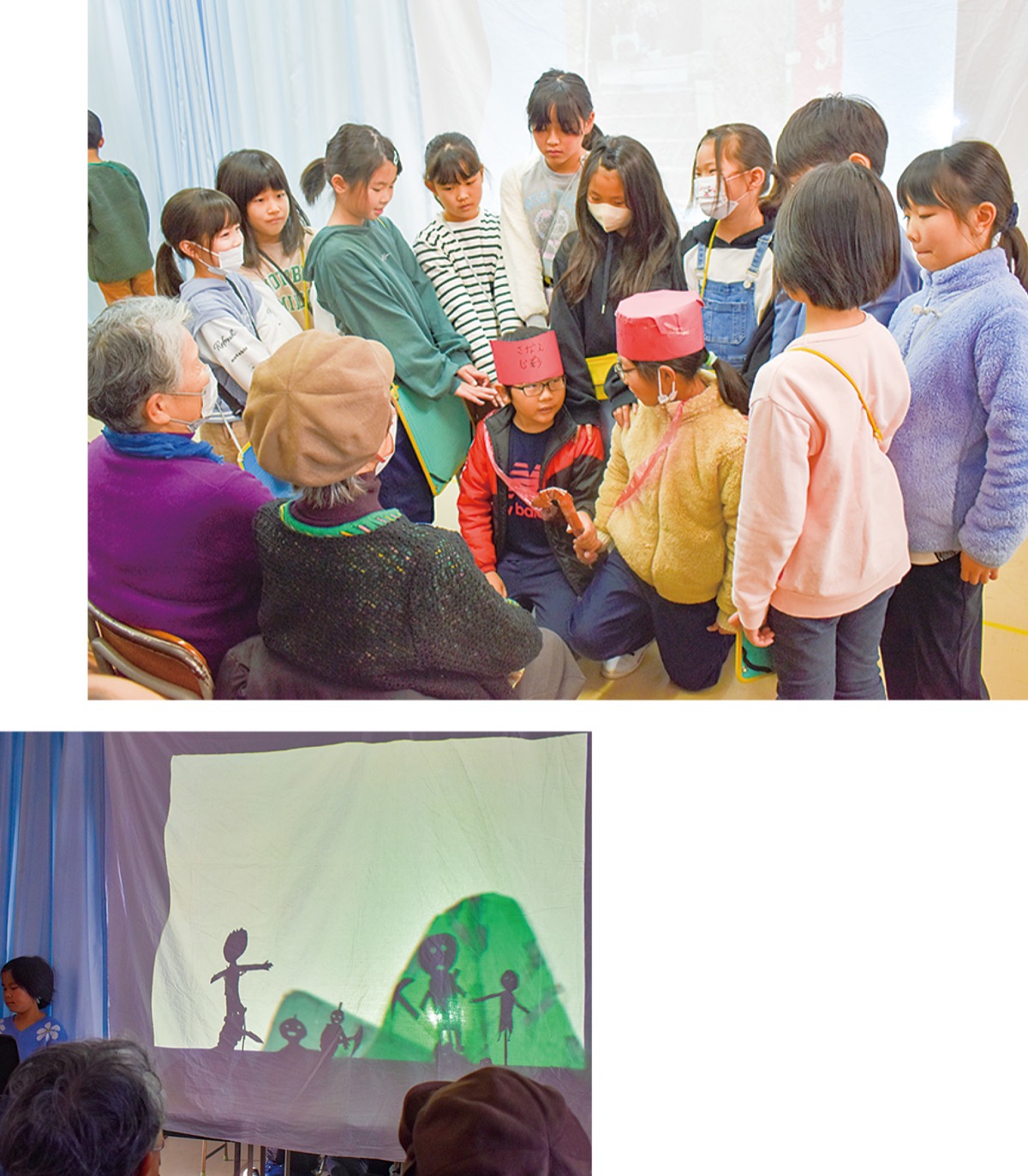 折本小学校(古屋澄人校長)の3年3組の児童が12月18日、10月に地元の民話を紙芝居で紹介してくれた大橋明美さんと三宅早苗さんを招き、影絵を披露した。