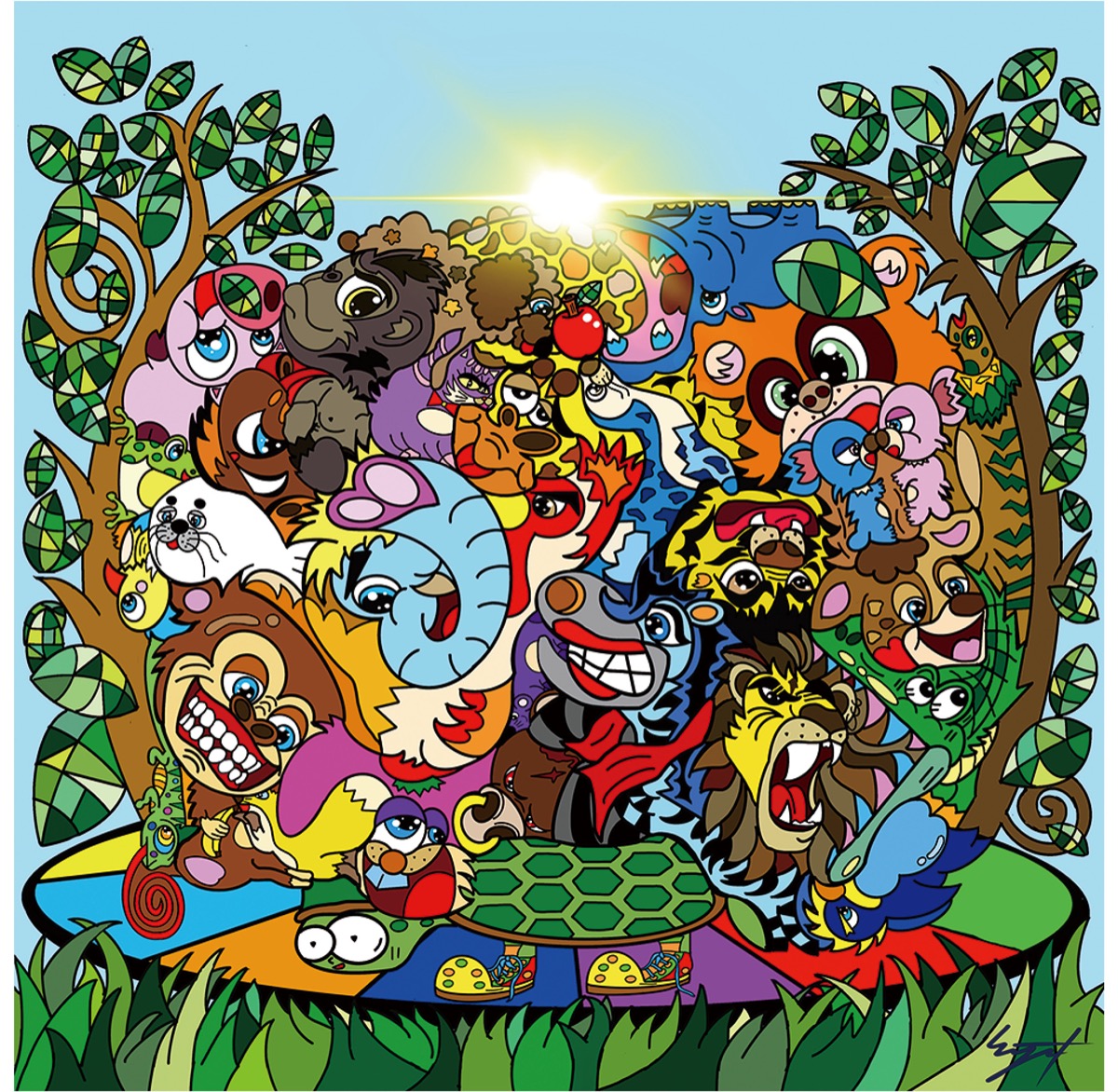 展示されるのは、絵本の表紙にもなっている「ボッチャの大きなりんごの木」=画像=をはじめ、ポップで鮮やかなイラストの数々。できないことがあっても「何で補えるかその都度考えればいい。人間の可能性は無限にある」と綴る滝川さん。自分の可能性を活かすことはヘトヘトになるが、それが「『生きてる』という証」だという。
