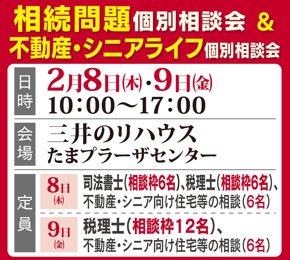 相続は、必要になってから考えても遅いことも。法律や税金、登記など専門知識が求められるので、事前の準備が肝要になる。そこで2月8日(木)と9日(金)に、三井のリハウスたまプラーザセンターで相続登記や遺言、成年後見制度、家族信託、不動産などの疑問や悩みを専門家に個別で聞ける「無料相談会」が行われる。完全予約制。