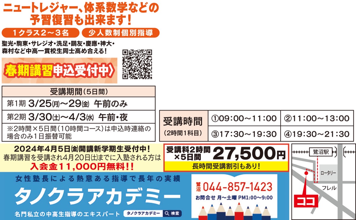 鷺沼で40年以上の実績を持つ私立中高一貫校生の英語・数学専門塾「タノクラアカデミー」では、春期講習の申し込みを受け付けている。