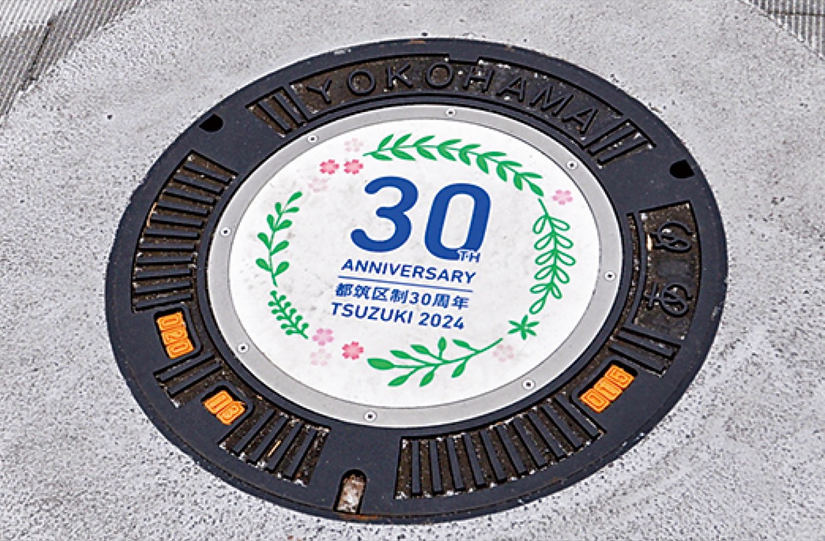 区制30周年記念事業の一環として都筑土木事務所はこのほど、30周年を祝うロゴマークの入ったマンホールを区内12カ所に設置した。