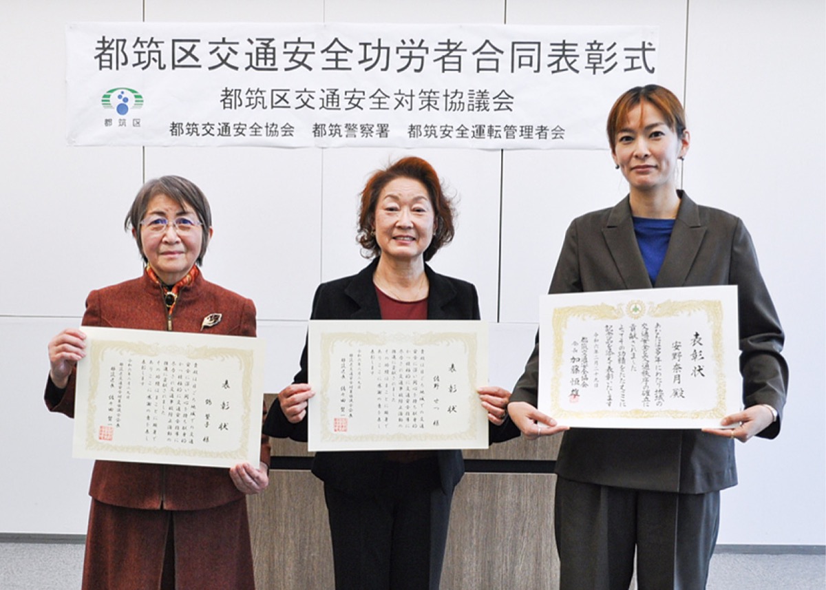 ▽区交通安全対策協議会功労者表彰=田口義弘、安藤博、日野正胤、鶴繫子、志田政明、斎藤昭、峯岸卓朗、佐野せつ、高橋代吉、小松崎みち子、登山みさ子▽区交通安全対策協議会功労団体表彰=川和東小学校学援隊▽都筑警察署長・都筑交通安全協会会長連名表彰=若林弘紀▽都筑交通安全協会会長表彰=安野奈月▽都筑警察署長・都筑安全運転管理者会会長連名表彰=(株)サカタのタネ(優良事業所)、橘勝也(優良管理者)、百中陽治(優良運転者)▽都筑安全運転管理者会会長表彰=(株)グリーンディスプレイ(優良事業所)、本江秀太郎(優良管理者)、二戸得徳(優良運転者)