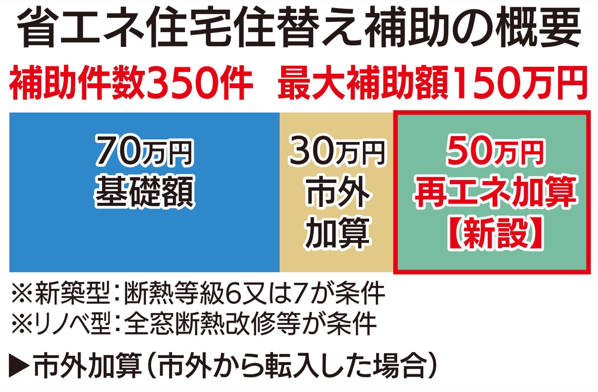 市の再エネ設備の設置について聞いたアンケートでは、設置をしない理由として7割近くが「初期設置費用が高いため」と回答。そこで今年度、最高レベルの断熱性能を備えた省エネ住宅等に住み替える費用の一部を補助する「省エネ住宅住替え補助制度」をモデル事業として実施した。対象を子育て世帯にすることで、高い省エネ性能を持つ住宅の普及と、子育て世代の市内転入・定住の促進を目指した。
