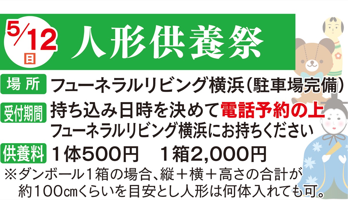 魂が宿るといわれる人形やぬいぐるみ。処分をしたいけど、どうしたらいいの--。そんな悩みに応えるため、「メモリアルアートの大野屋」は5月12日(日)に「人形供養祭」を都筑区仲町台の「フューネラルリビング横浜」で開催する。