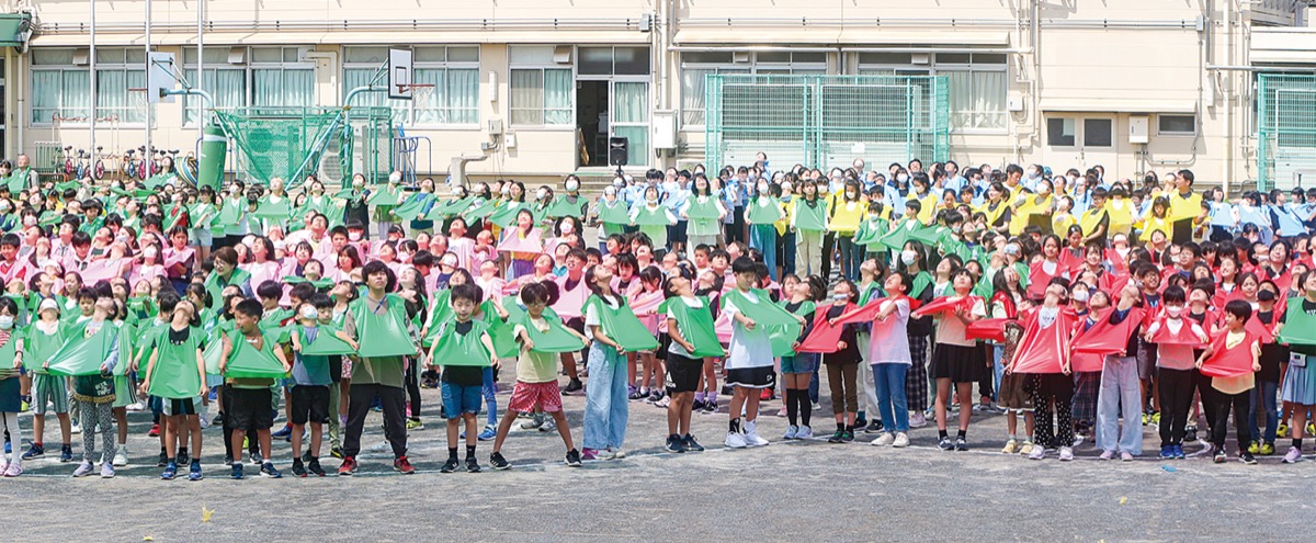 児童たちは、赤や黄色のカラフルなビニール製のエプロン=写真=をして登場。校庭に描かれた150周年キャラクターの「けろろん」を縁取るように並び、上空に向かってエプロンを広げた。