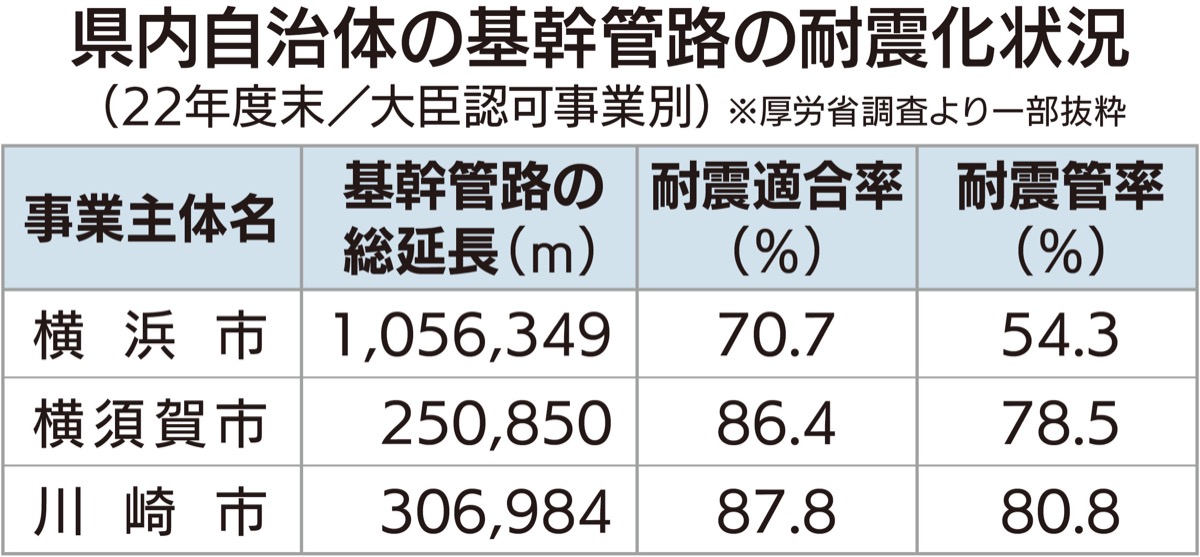 能登半島地震の被災地で、水道管の破損などにより深刻な断水被害が発生したことに関連し、厚生労働省は、全国の主要水道管の耐震適合率(2022年度末)を公表した。横浜市は70・7%と、全国平均(42・3%)を大きく上回っていることが分かった。
