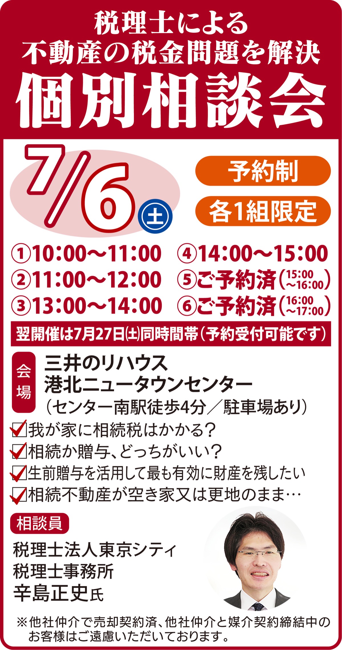 センター南駅近くの三井のリハウス港北ニュータウンセンターで7月6日(土)、専門税理士を招いた個別の無料相談会を開催する。