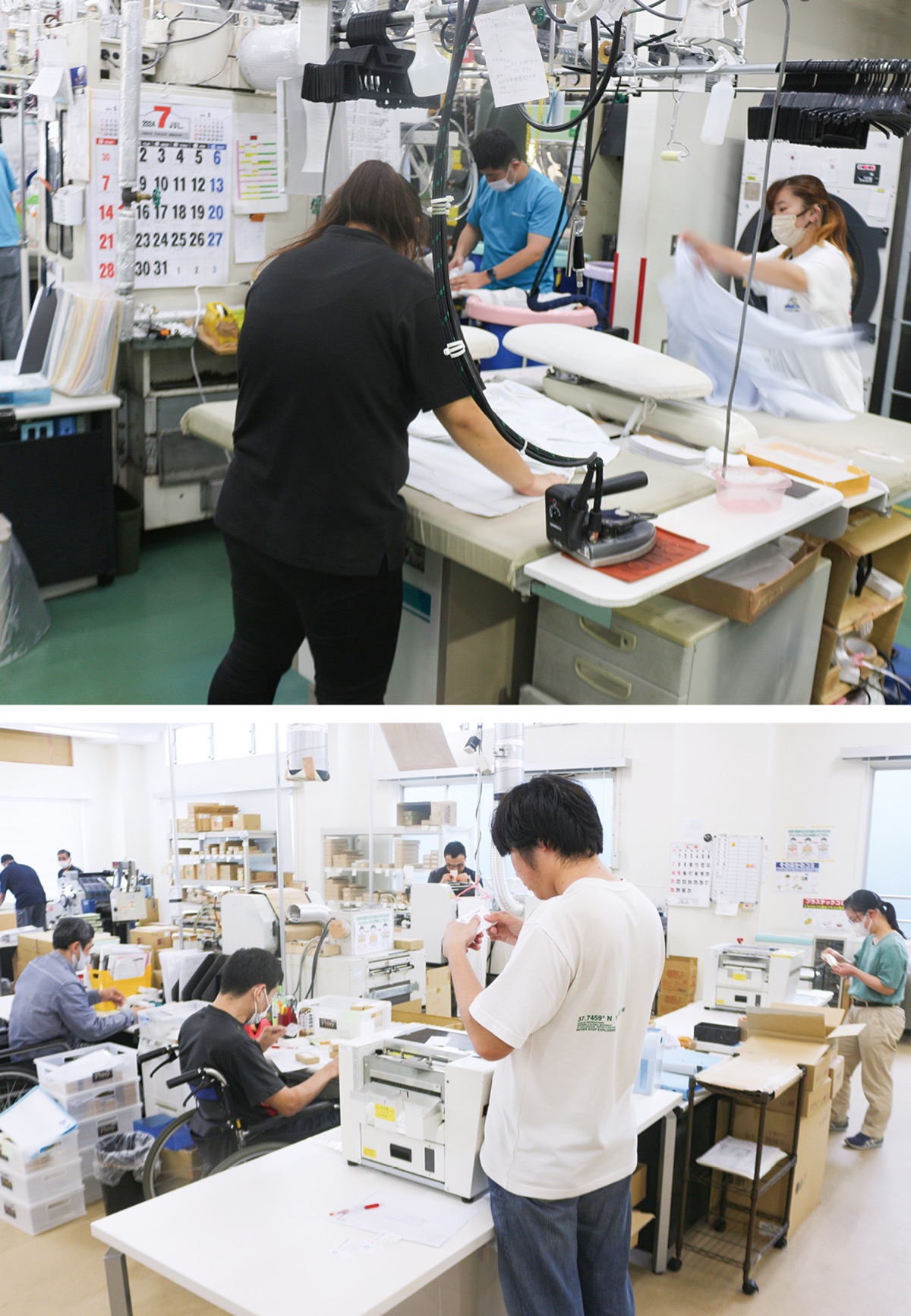 現在は129人の社員の内、障害のある社員は77人。10代から60代以上まで幅広い年齢層で、最も長い社員は勤続年数37年を数える。クリーニング士の資格を持つ障害者も8人いる。