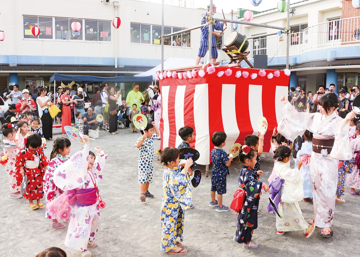 園庭と園舎を会場にフランクフルトやジュース、かき氷などの飲食物、輪投げやさかなつりなどゲームのブースが出展。園庭の真ん中には櫓が組まれ、浴衣や甚平を着た園児たちが、太鼓に合わせ、学年ごとに盆踊りを披露した=写真。