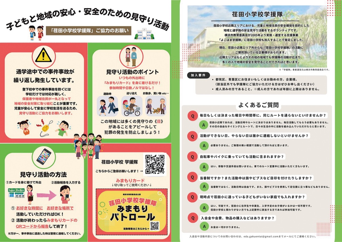 学援隊では全保護者に活動案内を配布。「できる範囲」での見守り活動として、通勤や買い物など外出時に、SZ内の変化に意識をむける「見守り活動」の協力を要請。参加は任意で、活動はスマートフォンで2次元コードを読み込むだけの簡単なものに。集まったデータは毎月の活動報告にまとめ、地域にも配布した。
