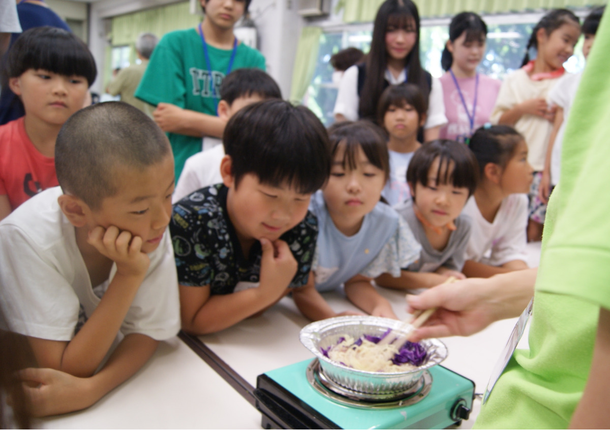 20日には、紫キャベツなどに含まれる色素成分「アントシアニン」を使った実験が行われた。児童らは、アントシアニンを抽出した液体に、酢や重曹、せっけんなどを混ぜ、変化する液体の色を観察。さらに、中華麺と混ぜて、着色する実験を見学した。
