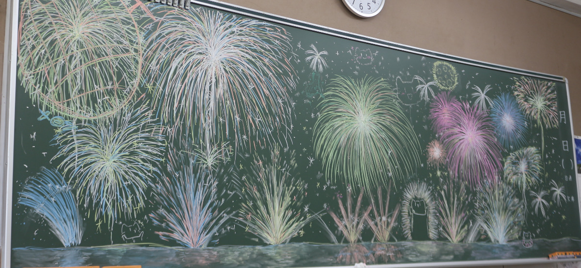 川和中学校(高部振司校長)の美術部員有志が、夏休み期間中の8月20・21日の2日間、新学期のはじまりに合わせ、全クラスの黒板にチョークで花火を「打ち上げた」=写真。