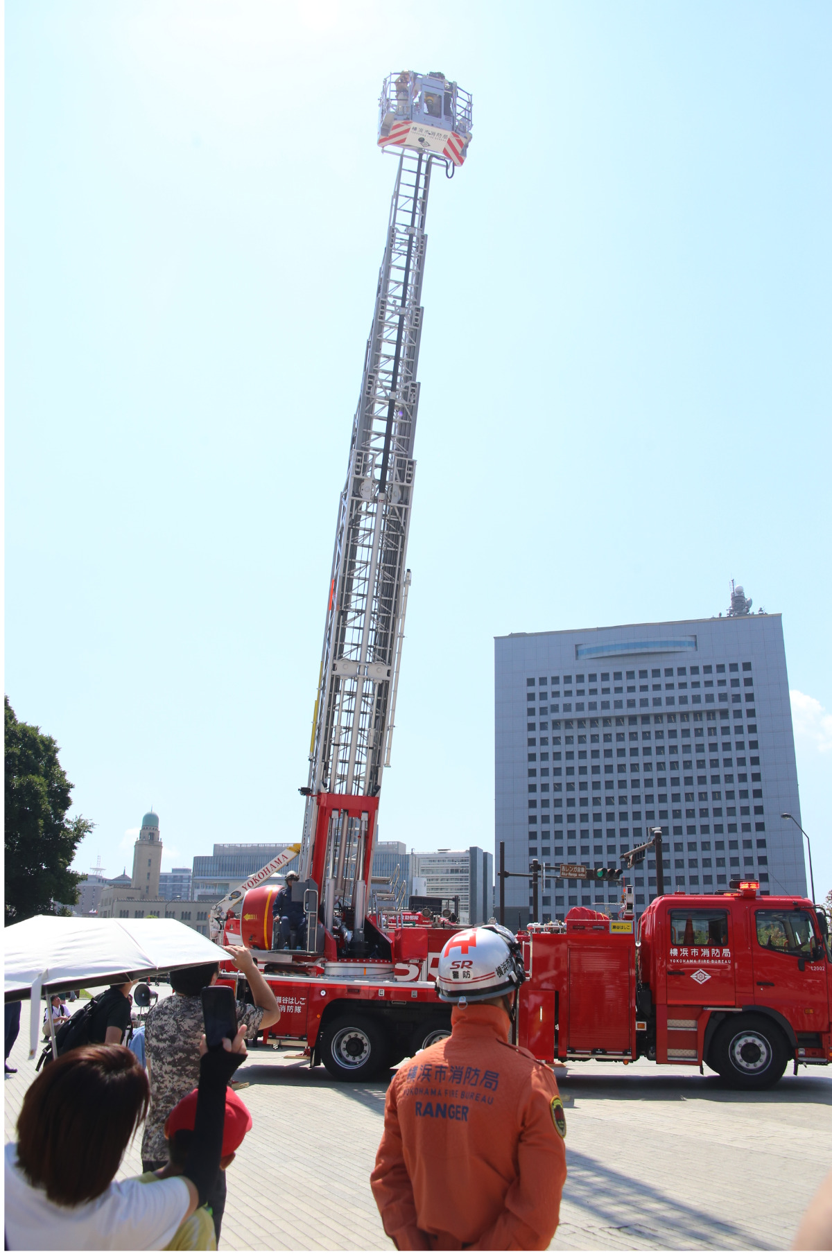 「学ぼう やってみよう 自助・共助」をテーマに、消防車やはしご車、防災関係車両が展示されたほか、トレーラーハウスなどの体験もあった。