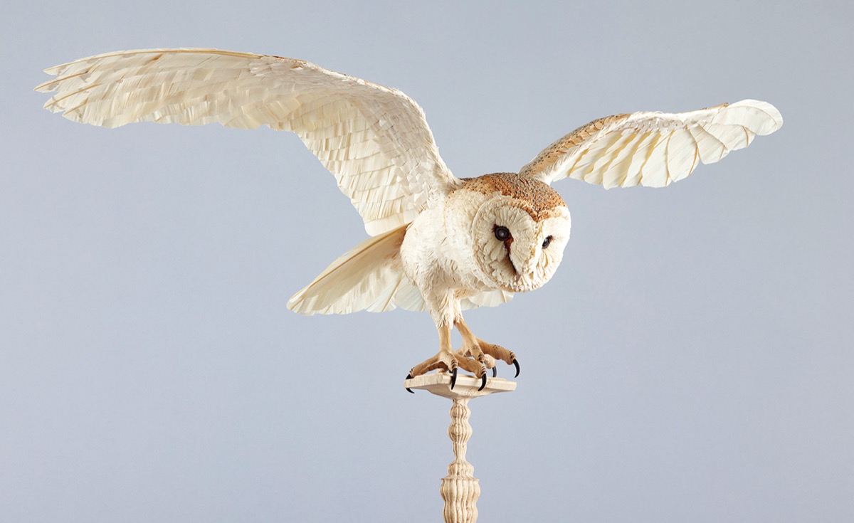 作品制作で鷲野さんがこだわったのはフクロウが「フワリ」と台座に着地する様子を表現するための「軽さ」。作品は61cm×71cm×30cmと大きなもの。フクロウの足1本で台座に自立させるため、胴体の中をくり抜き、大きく広げた羽根はぎりぎりまで薄くした。一方、羽根には寄木細工を施すなどの工夫も凝らされており、制作期間には約1年を要したという。