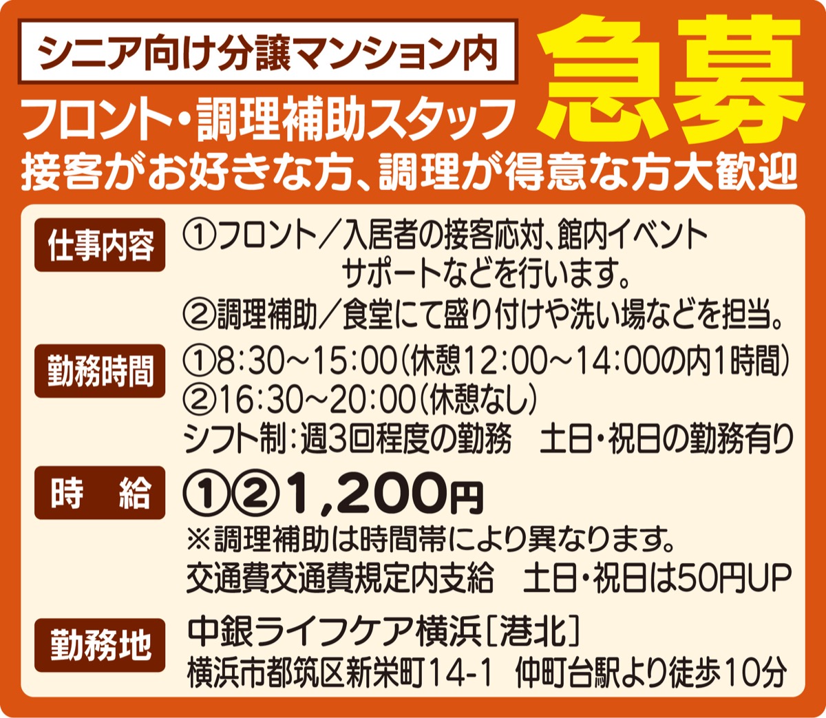 フロント・調理補助スタッフ「中銀ライフケア横浜[港北]」
