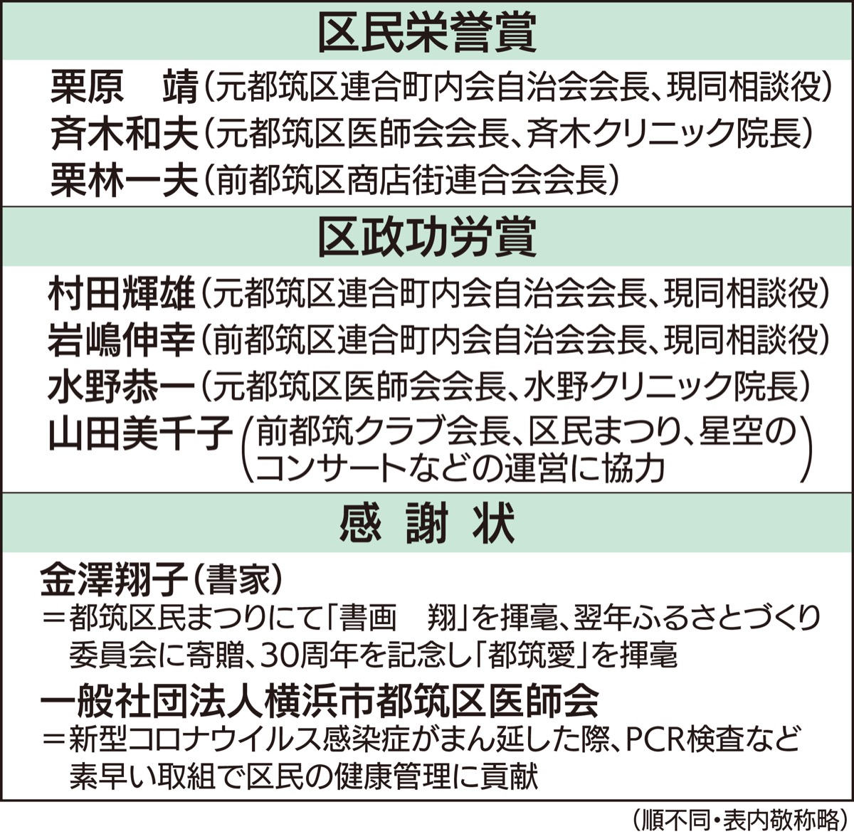 式典では表彰式も行われ、これまで区の発展に寄与した人に区民栄誉賞、区政功労賞が、書家の金澤翔子さんと(一社)横浜市都筑区医師会に感謝状が授与された。