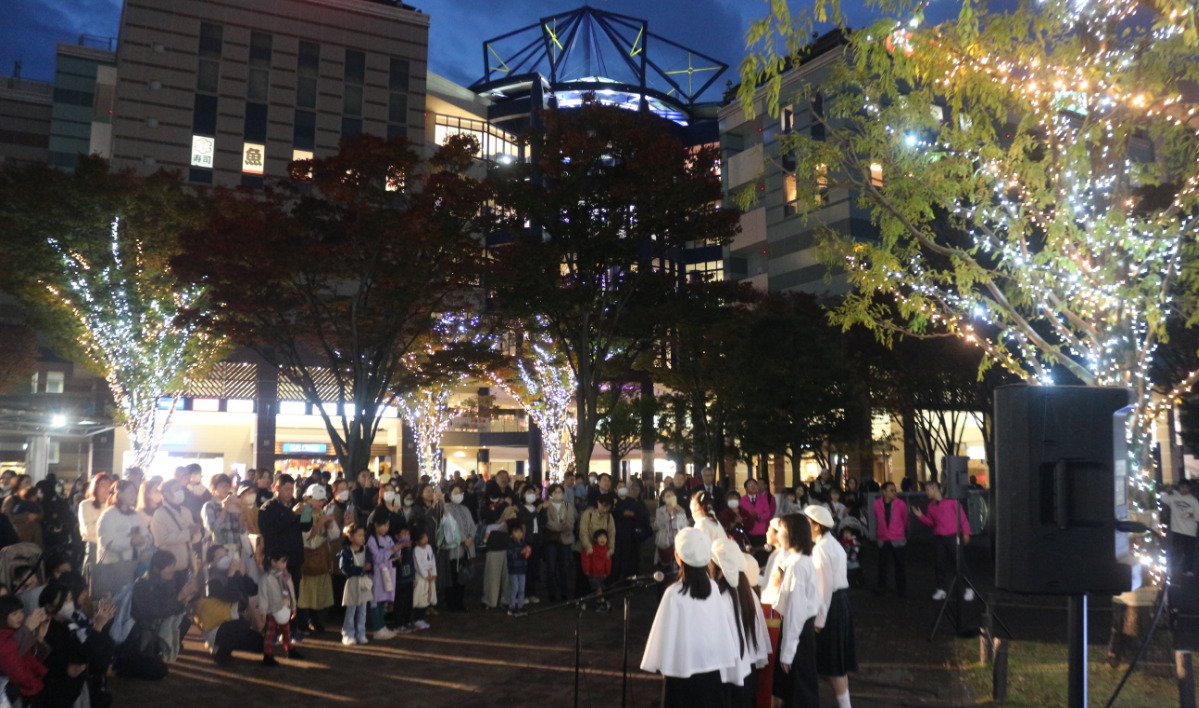 センター南駅前で11月15日、イルミネーションの点灯式が行われた。主催はセンター南商業地区振興会。点灯式の前にはソプラノ歌手の渡辺麻衣さんと都筑・かなりあ少年少女合唱団のミニコンサートを開催。その後のカウントダウンで、周辺の街路樹やショッピングモールのイルミネーションが一斉にライトアップされた。
