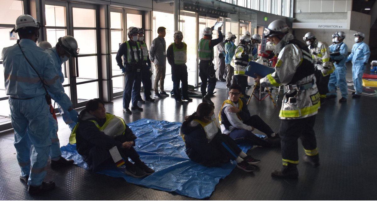 訓練は、国際プールでの大規模イベント終了後、退場途中に多数の観客が階段部分で将棋倒しになり、負傷者が多数発生したことを想定。職員らは通報や避難誘導などを行い、消防署員らは現地指揮本部の設置・運営や医療機関への搬送などを迅速に対応した。