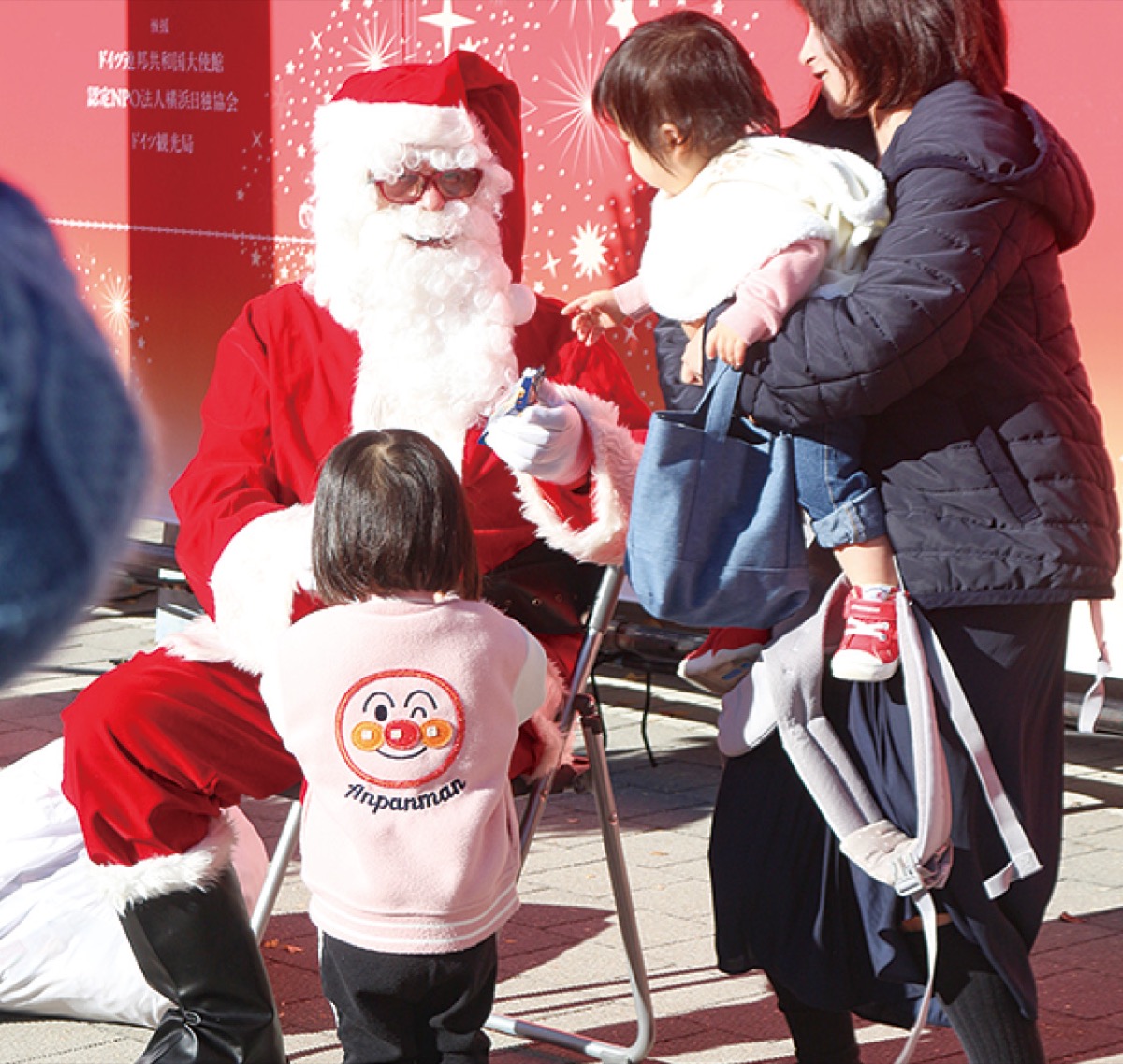 会場では東京横浜独逸学園やドイツゆかりの企業・団体が、ソーセージやプレッツェル、ビール、ホットワインなどの飲食物、クリスマスリースなどの雑貨を販売。広場の前に設置されたステージでは、歌やダンス、楽器演奏などが披露された。7日にはドイツのサンタクロース「聖ニコラウス」が登場。8日に行われたサンタクロースとの記念撮影には、多くの親子連れが行列を作った。