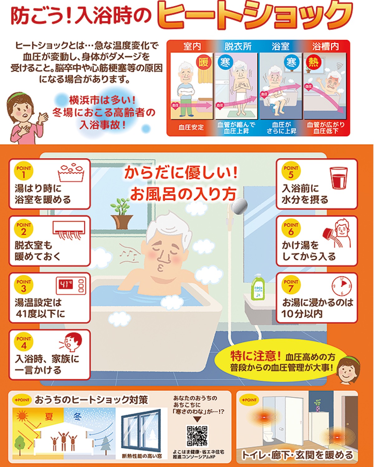 同署では、入浴前に浴室や脱衣所を暖める、入浴前に水分を摂取する、湯温を41℃以下に設定する、入浴時間を10分以内にするなどの、予防策の周知に努めている。また自宅の断熱性向上、トイレや廊下、玄関など屋内全体を暖めることも効果的だという。
