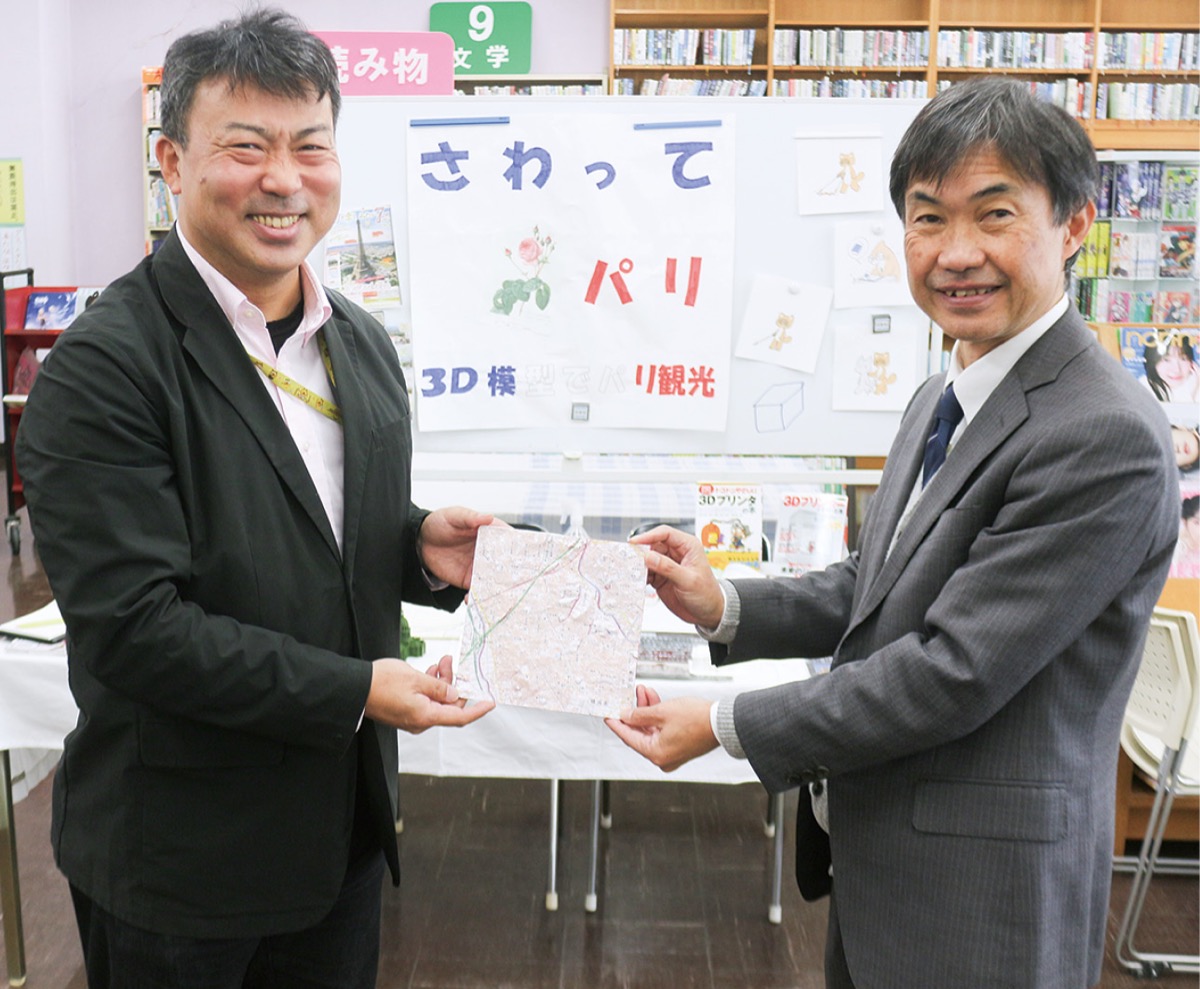 内容は生徒たちが興味を持ちやすいようにと五輪が開催されたパリを舞台に、「さわってパリ〜3D模型でパリ観光〜」と題し、関連書籍や元木教授が自作した凱旋門、エッフェル塔などの3D模型を展示。図書委員など約30人が聴講した。