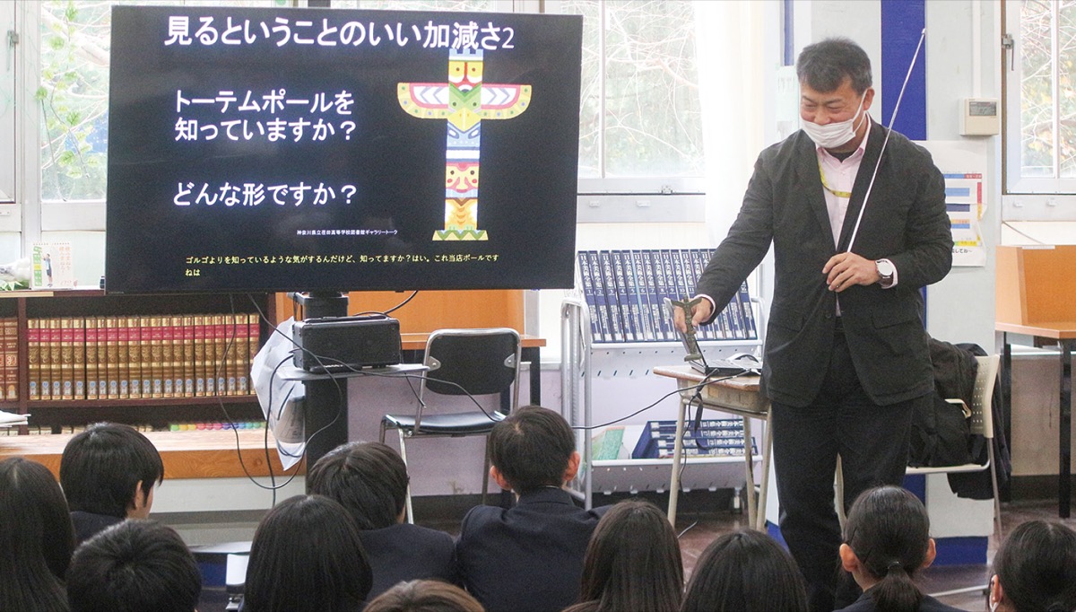 県立荏田高校(宮島和彦校長)は12月13日、鶴見大学文学部の元木章博教授を招き、図書館でギャラリートークを開催した。