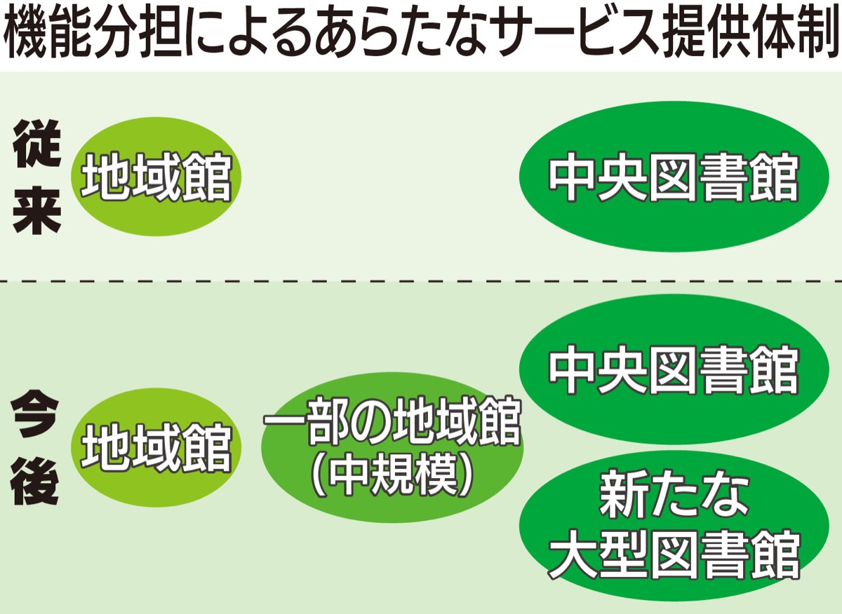 また、図書館以外の商業施設や地区センターなどで図書の受け取りや返却ができる「図書取次拠点」を増やすことも検討し、大型図書館が中心的な役割を果たす。