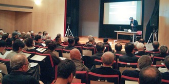 講演会には、約170人が来場。事前申込の抽選に漏れた人のために、会場隣室の研修室では、ライブ中継も行われた。