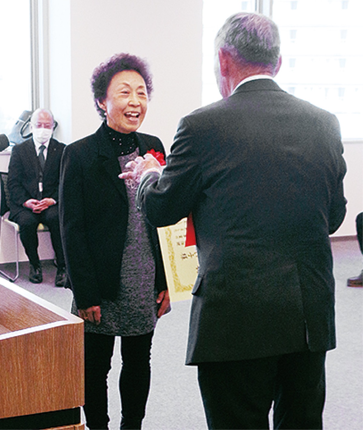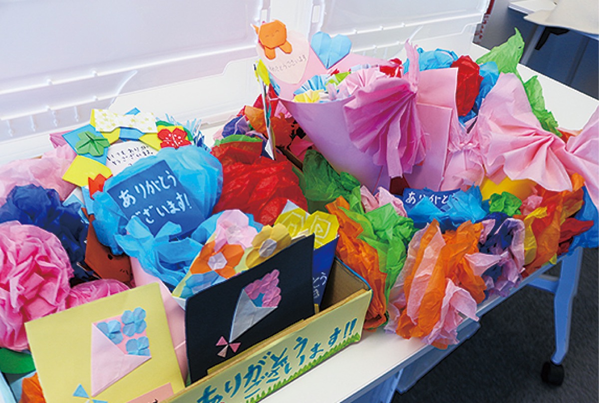 今年は表彰式に先立ち、茅ケ崎小学校5年5組の児童から、受賞者に向け、祝辞と歌、手作りの花束=左下写真=がプレゼントされた。