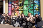 絵は、岩崎学園横浜デジタルアーツ専門学校=港北区=の総合デザイン科1年生7人が、同センターを活用した地域の賑わいづくりのために描いたもの。学生が絵を描いた窓の大きさは、縦約1・8m、横約3mで、約40cm四方の小窓で縦4等分、横7等分に仕切られている。7人の学生たちは、それぞれ縦1列の窓を使い、バスケットボールや横浜、海賊などをテーマに作画。二日がかりで完成させた。