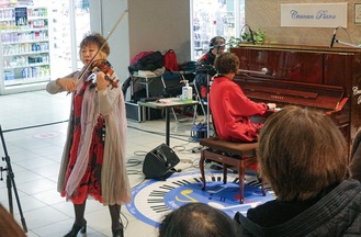 コンサートではピアニストの石塚まみさんとバイオリニストの牧千恵子さんが共演=写真。『花のワルツ』や牧さんのオリジナル『五周年おめでとう』を演奏。最後は『早春賦』を観覧者と一緒に合唱して、記念コンサートを締めくくった。