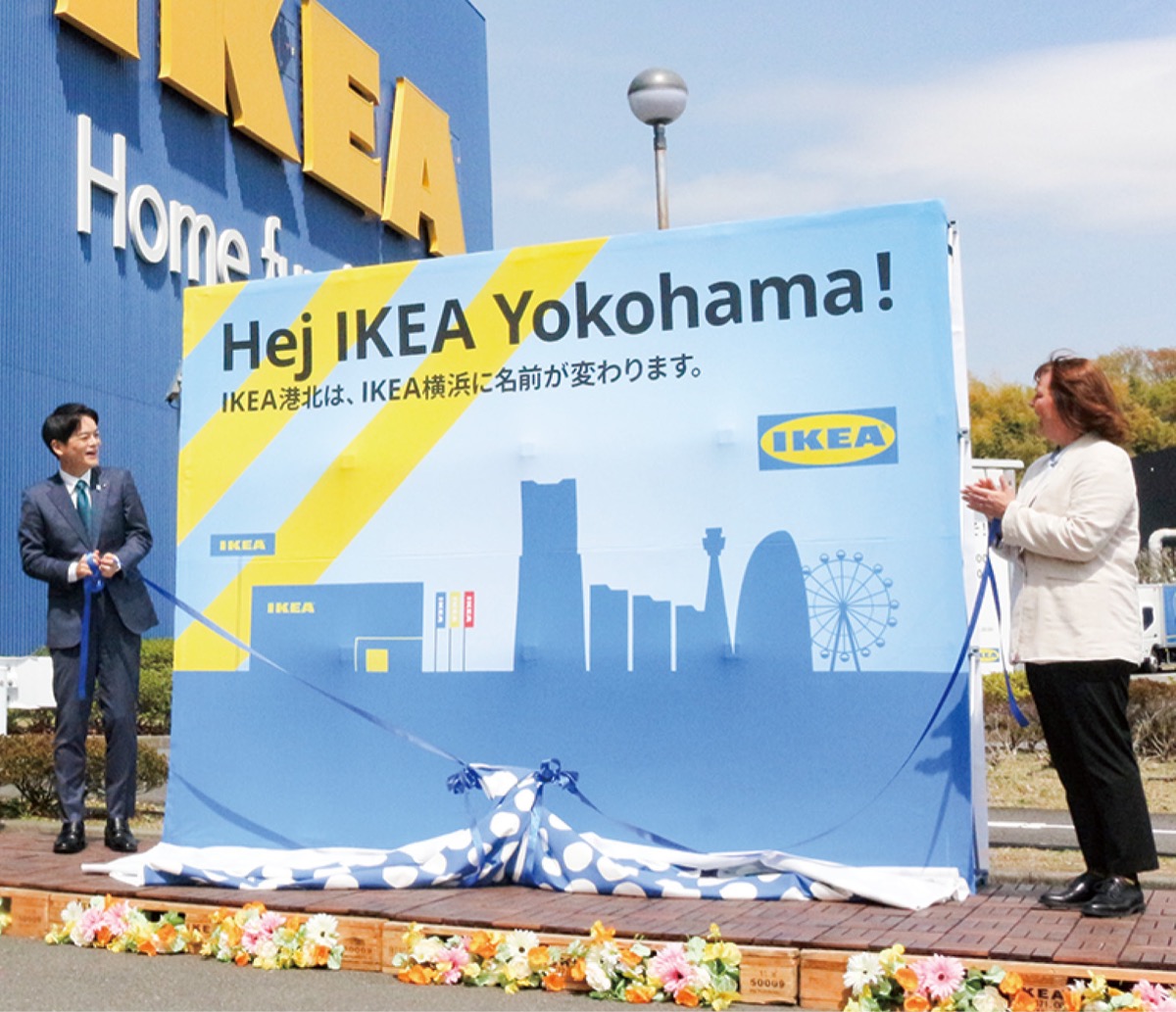折本町のIKEA港北が4月1日にIKEA横浜に名称変更したのを受け、5日、記念セレモニーが1階エントランス前で行われた。セレモニーではイケア・ジャパン株式会社のペトラ・ファーレ代表取締役社長兼CSOと山中竹春市長が名称変更を伝えるボードの除幕式に臨んだ。
