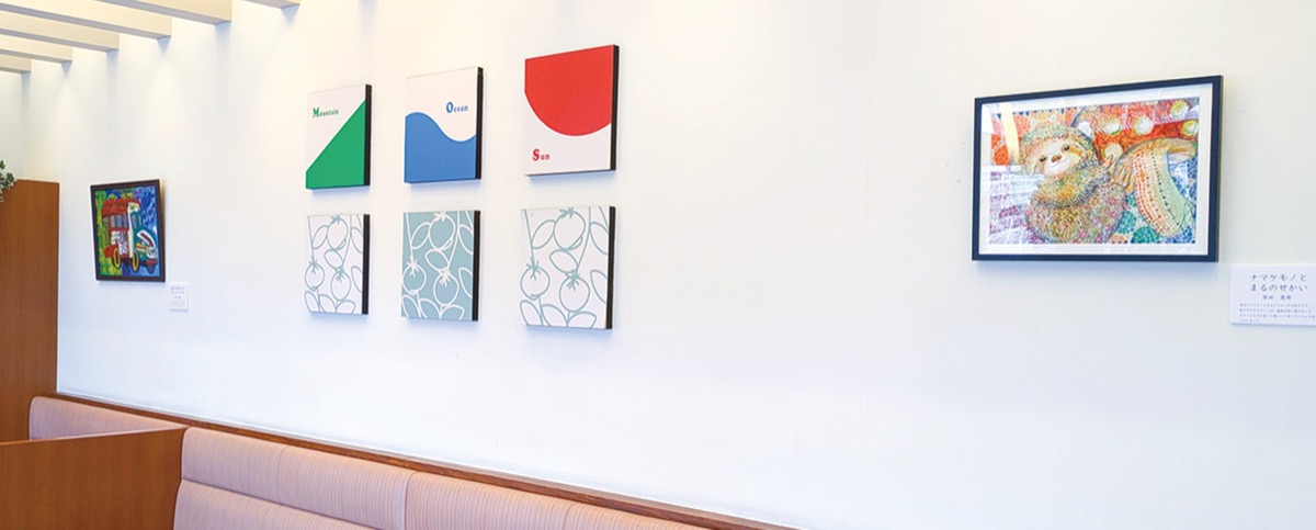 これは障害者の社会参加支援を目的に同社が2016年から行っている「MOSごと美術館」に連動する企画。展示されている作品は、社会福祉法人横浜市リハビリテーション事業団が指定管理者として運営する障害者スポーツ文化センターラポール上大岡と横浜ラポールの利用者が描いたもの。「MOSごと美術館」が横浜市内の店舗で実施されるのは初めてで、同店と青葉区の市ヶ尾駅前店で実施されている。